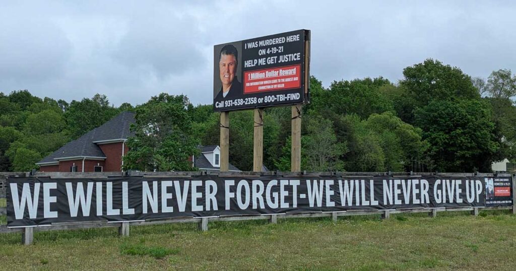 A billboard towers above a pasture fence in rural Tennessee, its message blunt and unflinching: “I WAS MURDERED HERE ON 4-19-21. HELP ME GET JUSTICE.”